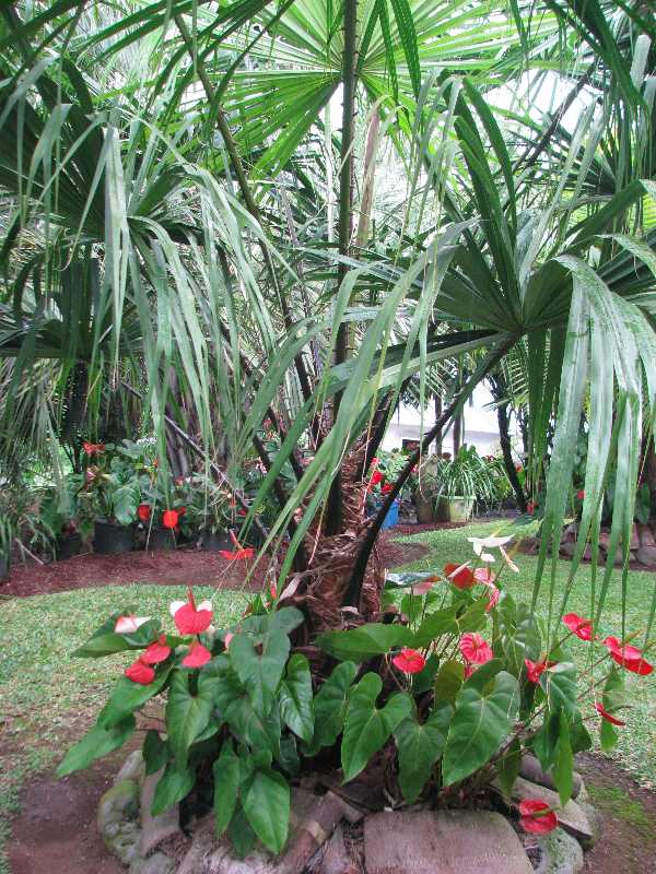 La propriété recèle encore de diverses variétés, parfois sous canopée, dont un grand Brahea dulcis aux feuilles costapalmées, un longiligne Archontophoenix alexandrae chargé de fruits, plusieurs Dypsis (D.decaryi, D. madagascariensis, D. fibrosa, D. leptocheilos,…), de jolies touffes de Pinanga coronata et de Ptychosperma macarthurii, et plein de petits sujets du genre Chamaedorea.